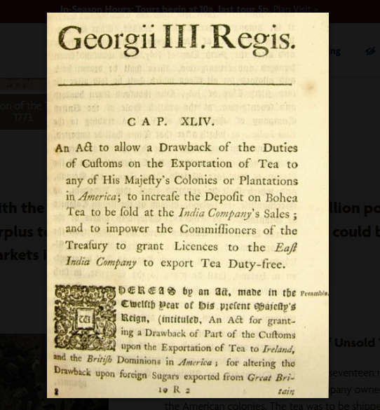 To the right of this page, you will see an image of a document discussing the Tea Act. The Tea Act was a law passed by the British Parliament. This allowed tea to be directly shipped to the American colonies. Even though the price of tea became cheaper, it still included a tax. This reinforced the British rig.ht to tax the colonies without representation. Many of the colonist believes that this is unfair because they believe their government should have the power to tax them and not the British Parliament. This also hurt local merchants who depended on selling tea to make a living. The colonists felt like their rights and freedom were being threatened, which helped lead to the American Revolution